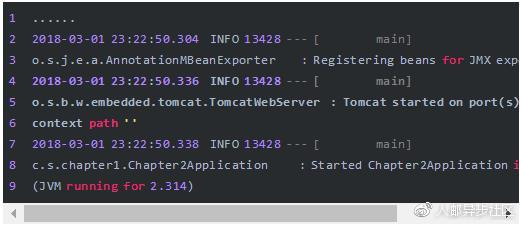 这样以Java Application的形式运行Chapter2Application就可以看到Spring Boot绑定的Tomcat的启动日志: