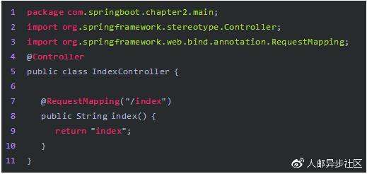 这里的spring.mvc.view.prefix和spring.mvc.view.suffix是Spring Boot与我们约定的视图前缀和后缀配置,意思是找到文件夹/WEB-INF/jsp/下以.jsp为后缀的JSP文件,那么前缀和后缀之间显然又缺了一个文件名称,在Spring MVC机制中,这个名称则是由控制器(Controller)给出的,为此新建一个控制器IndexController,其代码如代码清单1-6所示。
