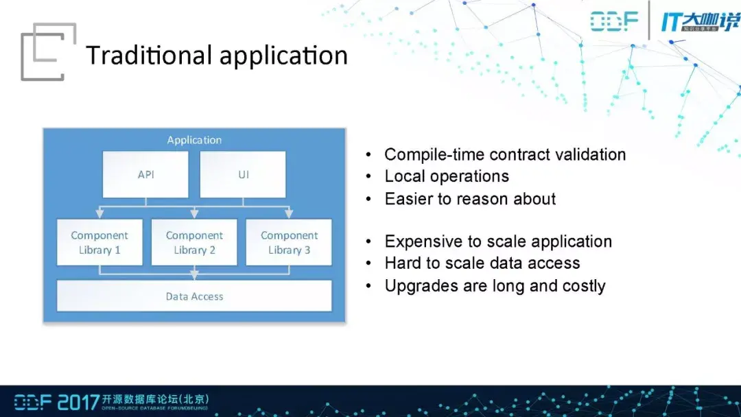 传统应用程序的API、UI、引擎等都是整合在一起,在编译的时候就能确定相互之间的依赖关系并能够方便的发现问题。不过由于所有的模块都被整合在一起,牵一发而动全身,所以在水平扩展服务能力的时候要付出相当大的代价。