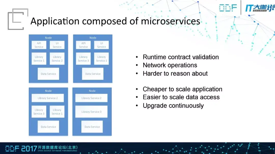 不同于传统应用,微服务框架中所有的模块都是一个独立的进程,模块之间通过HTTP或者RPC等协议进行沟通。相当于应用中包含多个服务,服务之间通过标准协议调用,不过只有在运行时才能发现错误,而非编译的时候。由于是完全基于网络的框架,所以必须要考虑到网络延迟的问题。微服务所带来的好处在于能够很方便的升级,模块数据相对来说容易监控,模块升级也已经可持续。