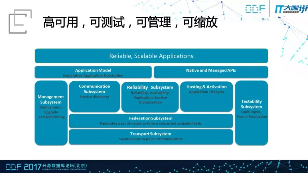 整个Service Fabric提供了一个更好的底层框架,能够实现高可用、可测试、可管理、可缩放。可测试指的是在服务升级的时候可以支持灰度发布,还可以设定某个条件判断升级版本是否有问题,一旦发现问题就会自动的回滚。可管理指的是基于内核级的检查和管理,当某个节点出现问题的时候,该节点上的运行的任务会在其他的节点上被自动的管理恢复。可缩放指的是增加节点的时候,整个任务会被重新分配。