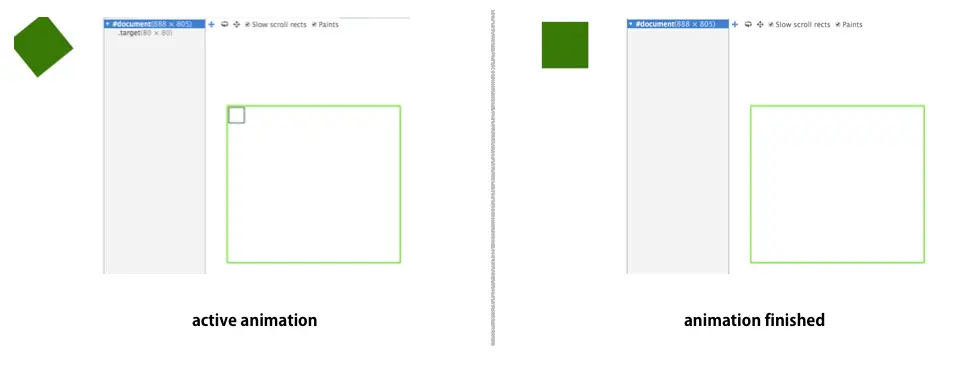 可以看到未提升 target element 为合成层,transform 和 opacity 依然会触发 paint。