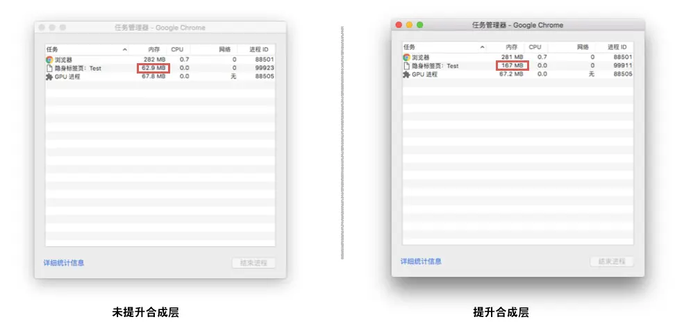 demo 1 和 demo 2 中,会创建 2000 个同样的 div 元素,不同的是 demo 2 中的元素通过 will-change 都提升为了合成层,而两个 demo 页面的内存消耗却有很明显的差别。