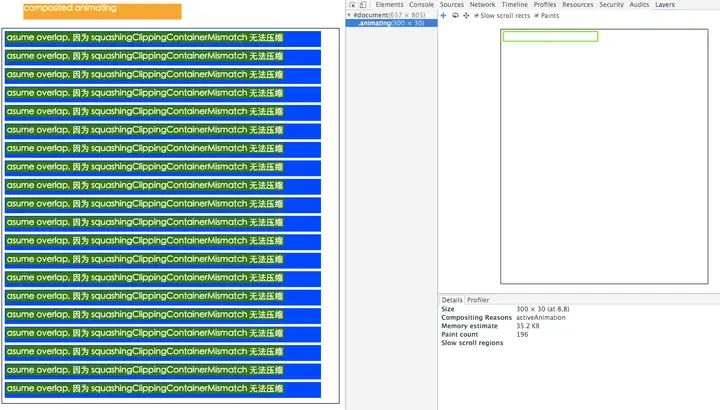 demo 中,.animating 的合成层在运行动画,会导致 .inner 元素因为上文介绍过的 assumedOverlap 的原因,而被提升为合成层,同时,.inner 的父元素 .box 设置了 overflow: hidden,导致 .inner 的合成层因为 squashingClippingContainerMismatch 的原因,无法压缩,就出现了层爆炸的问题。
