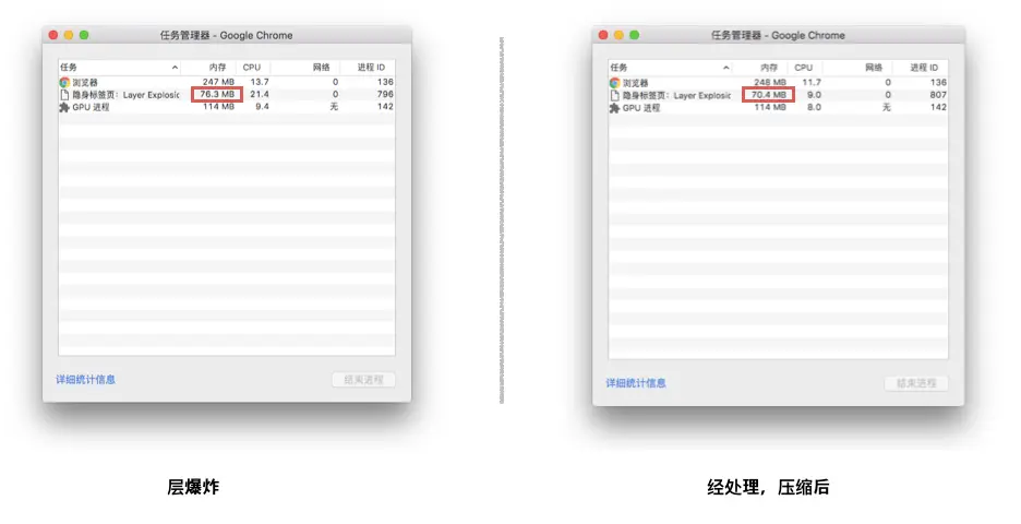 看完上面的文章,你会发现提升合成层会达到更好的性能。这看上去非常诱人,但是问题是,创建一个新的合成层并不是免费的,它得消耗额外的内存和管理资源。实际上,在内存资源有限的设备上,合成层带来的性能改善,可能远远赶不上过多合成层开销给页面性能带来的负面影响。同时,由于每个渲染层的纹理都需要上传到 GPU 处理,因此我们还需要考虑 CPU 和 GPU 之间的带宽问题、以及有多大内存供 GPU 处理这些纹理的问题。