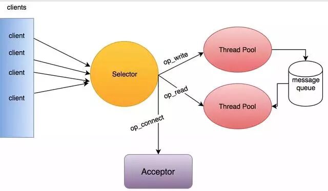 在kafka服务端采用的是多线程的Selector模型,Acceptor运行在一个单独的线程中,对于读取操作的线程池中的线程都会在selector注册read事件,负责服务端读取请求的逻辑。成功读取后,将请求放入message queue共享队列中。然后在写线程池中,取出这个请求,对其进行逻辑处理,即使某个请求线程阻塞了,还有后续的县城从消息队列中获取请求并进行处理,在写线程中处理完逻辑处理,由于注册了OP_WIRTE事件,所以还需要对其发送响应。