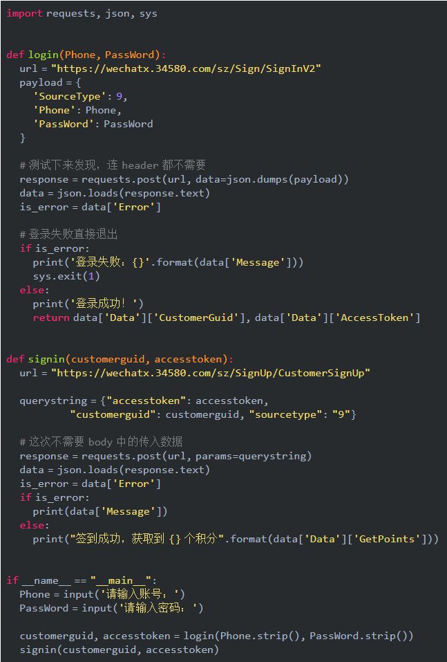 通过上面的分析,我们的签到流程也很清晰了,首先就是登陆获取 accesstoken 和 customerguid,然后再去签到就可以了!