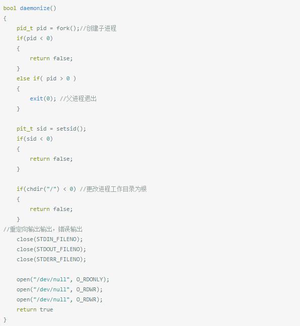 最后,如何在代码中让一个进程以守护进程的防止运行,守护进程的编写遵循一定的步骤,下面一个实例。