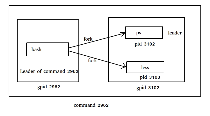 在bash_shell 下执行ps和less命令,所以ps和less命令的父进程时bash命令,这个可以从PPID(父进程PID)一列看出。 这三条命令创建了一个会话(SID是2962)和两个进程组(PGID:2962, 3102)bash命令的PID,PGID和SID都相同,显然它时会话的首领, 也就是组2962的首领。ps时3102的首领,