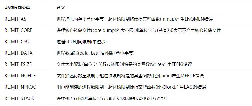Linux上运行的程序都会受到资源限制的影响,比如物理设备限制(cpu数量,内存数量等),系统策略限制(cup时间等),以及具体实现的限制(文件名最大长度)Linux系统资源限制可以通过如下一对函数来读取和设置: getrlimit , setrlimit