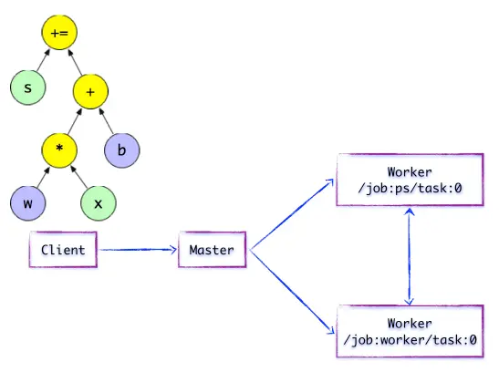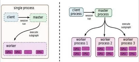 TensorFlow有一个重要组件client,顾名思义,就是客户端,它通过Session的接口与master及多个worker相连。其中每一个worker可以与多个硬件设备(device)相连,比如CPU或GPU,并负责管理这些硬件。而master则负责指导所有worker按流程执行计算图。TensorFlow有单机模式和分布式模式两种实现,其中单机指client、master、worker全部在一台机器上的同一个进程中;分布式的版本允许client、master、worker在不同机器的不同进程中,同时由集群调度系统统一管理各项任务。