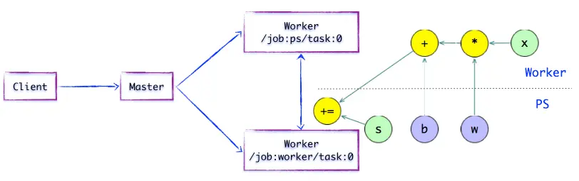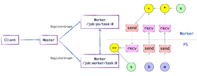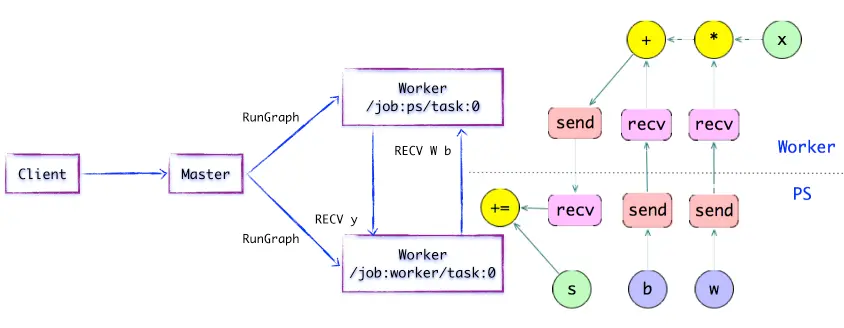 如上图所示,存在一种合理的「子图片段」划分算法。Distributed Master将模型参数相关的OP进行分组,并放置在PS任务上。其他OP则划分为另外一组,放置在Worker任务上执行。
