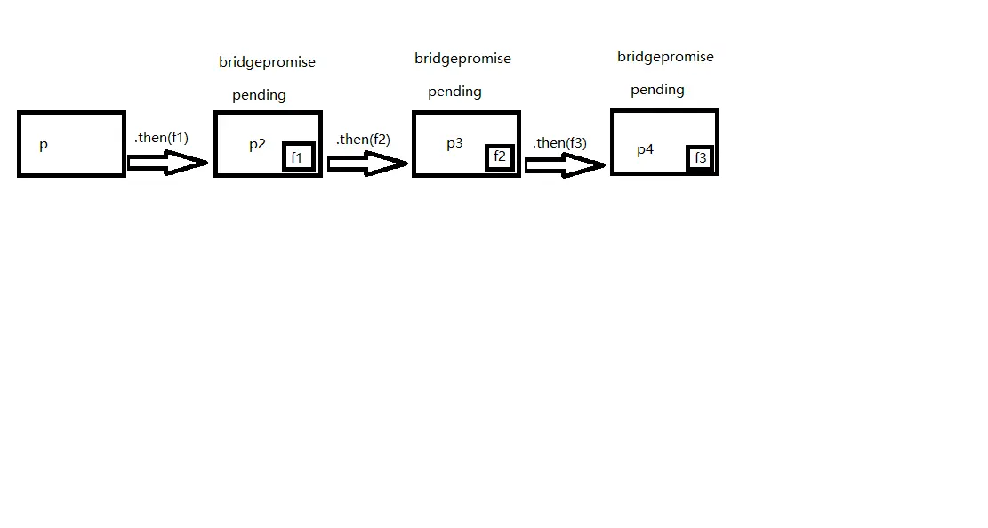 - 先执行p.then(f1)返回了一个bridgePromise(p2),并在p的onFulfilledCallbacks回调列表中放入一个回调函数,回调函数负责执行f1并且更新p2的状态.