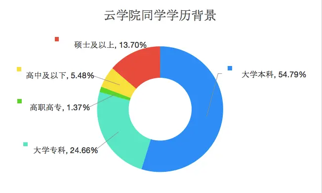 - 根据调研显示,云学院同学普遍为高层次用户,本科及以上学历背景占比为68.5%,其中硕士及以上的占比为13.7%,毕业于包括清华大学、浙江大学在内的985/211高校的比例高达33%,还有多名同学毕业于加拿大阿尔伯塔大学、法国巴黎第五大学等多家国外知名大学