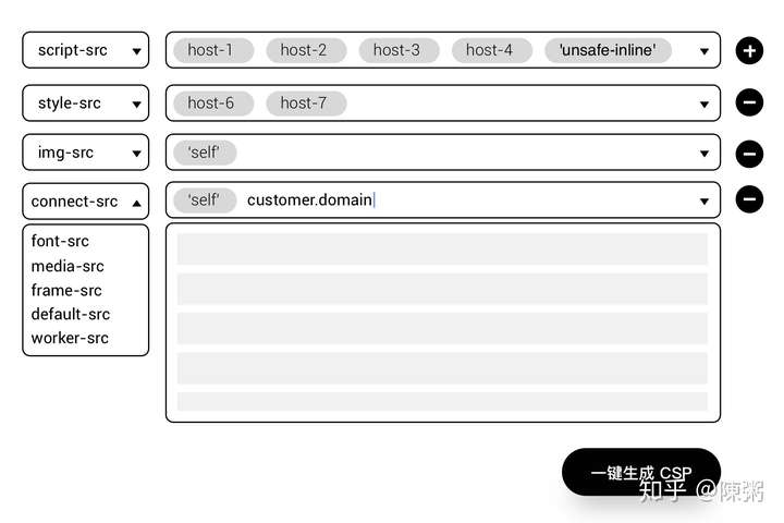 首先想到的肯定是手动穷举,但在中小项目且你清晰全链路的情况下这样做没什么问题,甚至 Policy 全部降级到 default-src 问题也不大。但穷举缺点也很明显: