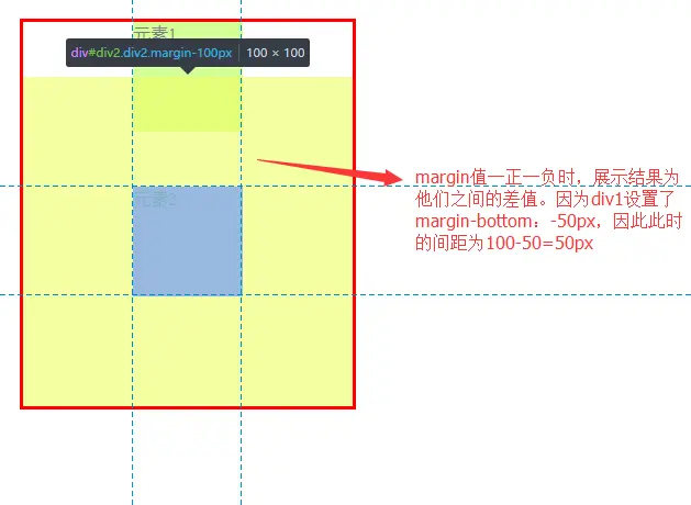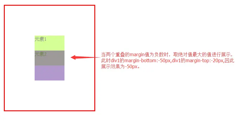当div1的margin-bottom和div2的margin-top值一正一负时,则重叠时,取他们之间的差值展示。如下图展示: