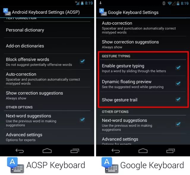 猜猜源代码在哪里?不在AOSP。上图可以看到两种输入法的选项。Google键盘具有滑动输入选项,而AOSP则没有——在Google输入法发布后它立即被放弃了。