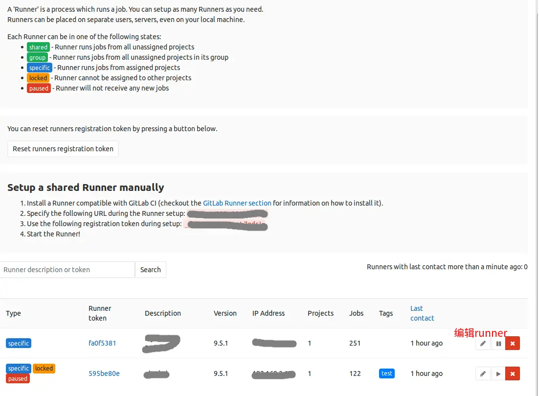 在第3步注册过程中, 会填一些信息,按提示一直往下走就行了,其中toker可以在我们的gitlab管理员主页获得 ip/admin/runners.