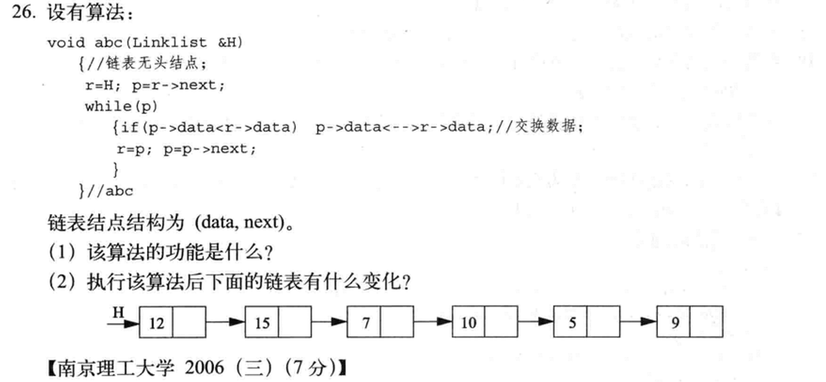 相邻元素相比较,逆序交换,算法结束时,最大元素调整到链表的末尾