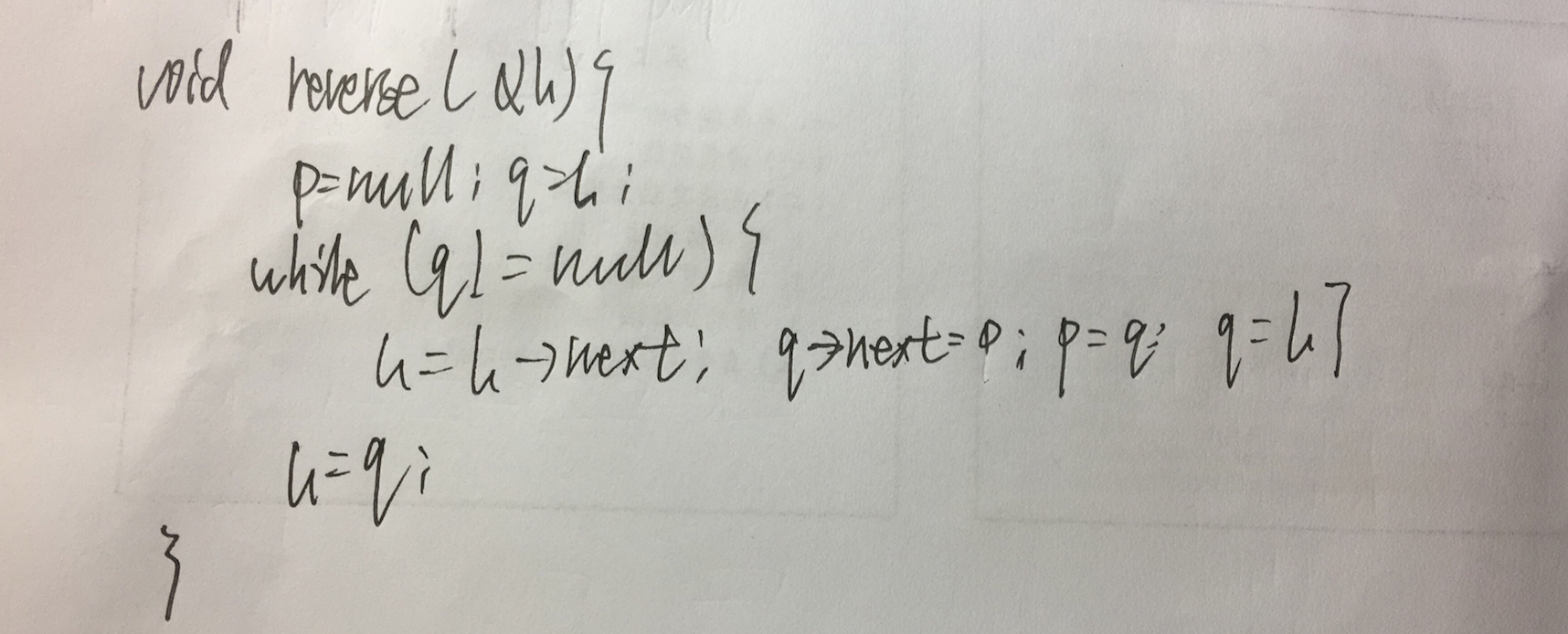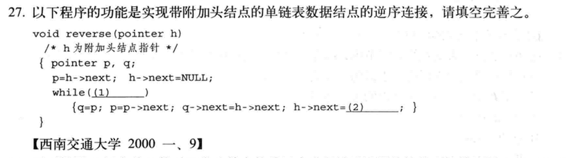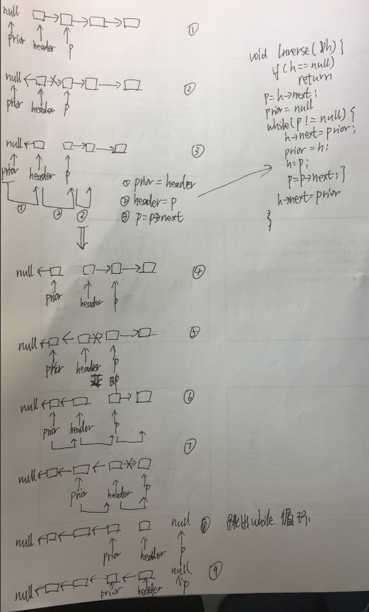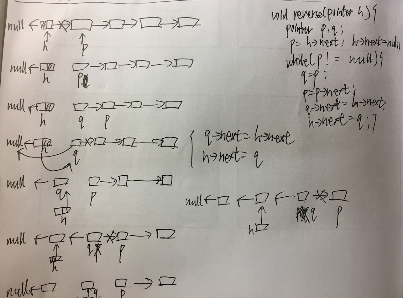 h->next节点,p节点,q节点,三个指针实现了反转,最后同样形成了一个带有头结点的链表