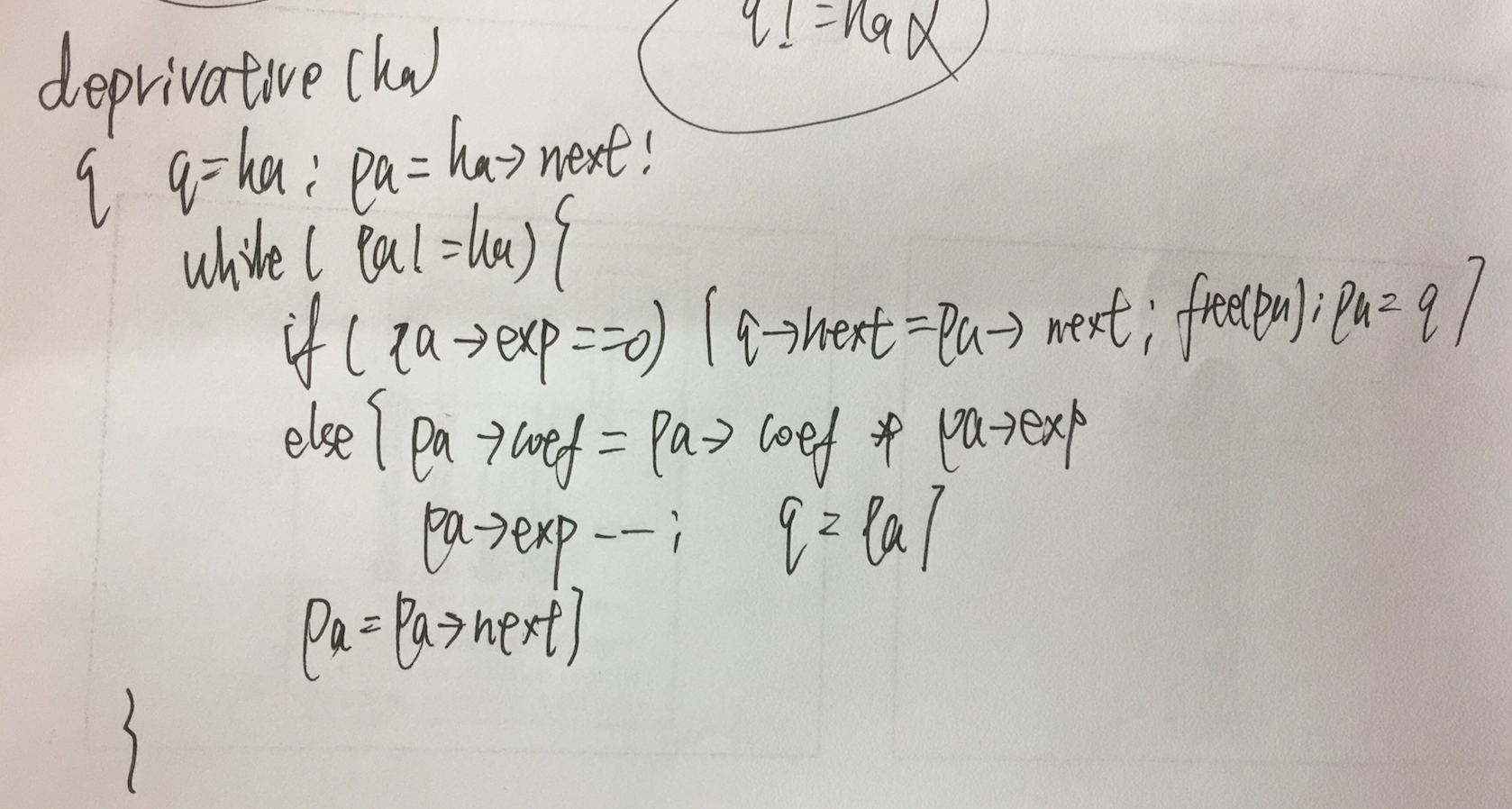q指针的作用就是始终指向pa节点的前序节点,仅仅是为了在遇到常数的时候,删除pa节点用的,因为这个时候,需要调用free(pa),就需要知道前序节点,而对于正常的情况(求导之前不为0),是不需要pa的