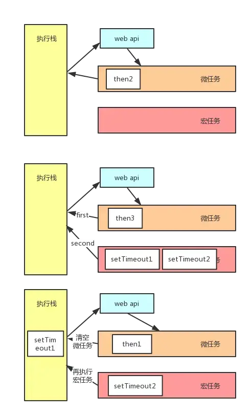 - 微任务宏任务同时出现,先将微任务放入执行队列,栈为空则先执行then2。setTimeout1放入宏任务执行队列中