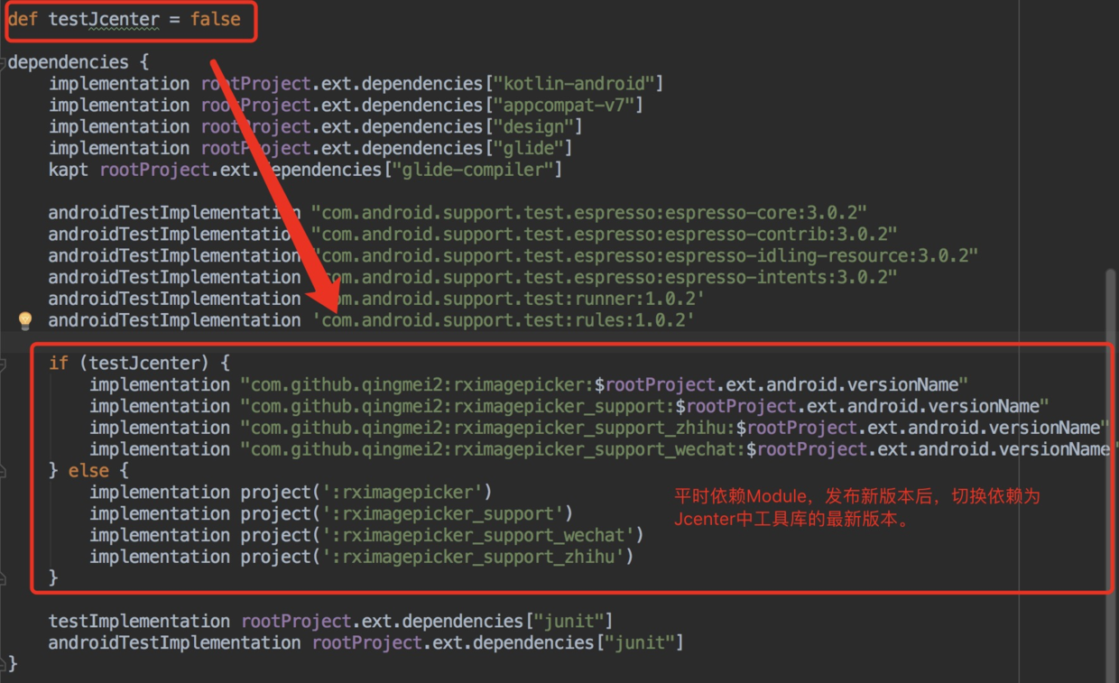 另:Groovy是一个非常好用的语言,在我的个人项目中,每次我发布新的版本,我需要让sample去依赖Jcenter远端的版本;而开发时会去依赖project中的Module,这样通过添加配置一个变量,作为开关进行版本控制即可: