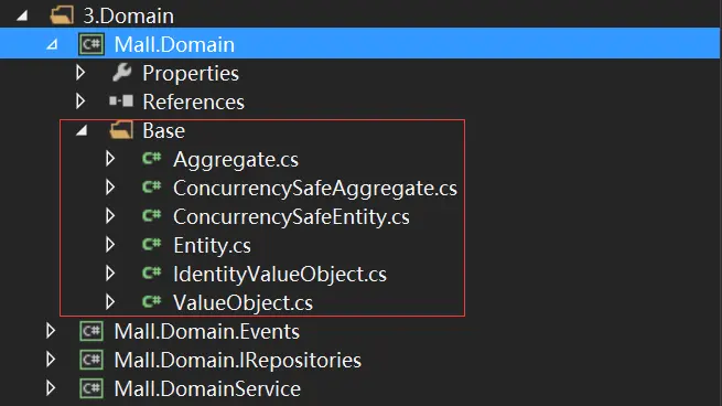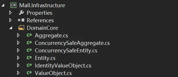 这是一种比较常规的技术分层思维方式产生的结果,在某些项目文件中或多或少有那么几个"Base"、"Core"、"Common"等的文件夹存放着一些通用的类,它们起着对当前项目中类的抽象、实现通用性支撑性功能的作用。然而在DDD中这些都应属于基础设施层的事情,这样能够保证其他层专注于自身的职责,不会把本应内聚的东西泄露到这些类中。如我们当前的领域层就专注于领域建模,里面的概念全部与通用语言相关。说干就干,搬到基础设施层去,再取个能表达出一致概念的名字的模块存放,如图2。