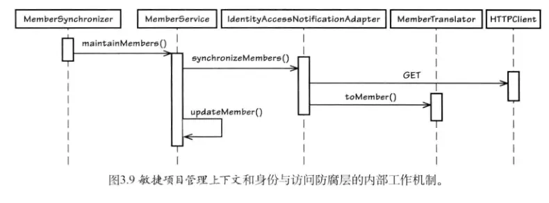 对于我们.Net开发人员来说,在分布式场景下用的最多的方式无非是WebAPI和WCF了。这种方式也就是在第一篇文章中所提到的发布语言和开放主机服务,那么对于客户端来说需要做好防腐层(第一篇文章中有提到)的工作,好避免外部上下文的概念侵入到自身的领域概念中。一个普遍的防腐层实现时序图,其中真正负责防腐层工作的是XXXAdapter和XXXTranslator,如下(摘自[Vaughn Vernon]《实现领域驱动设计》):