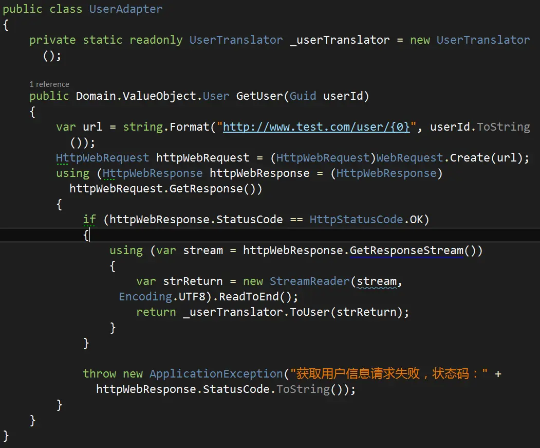 其中ProductAdapter、UserAdapter分别负责请求商品上下文和用户上下文并取得原始结果,ProductTranslator、UserTranslator则是通过解析原始结果,转换为我方上下文中需要的领域模型概念。以下则是核心部分的实现:
