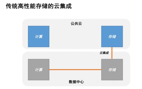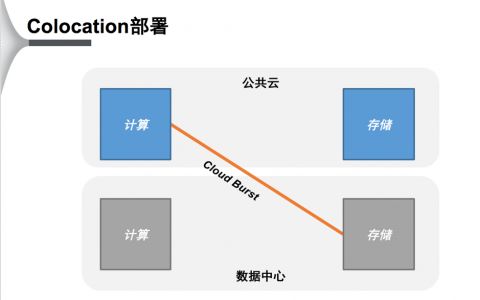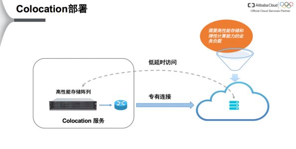 当前的一个解决方案是“Colocation”的部署方式。线下的IDC实现企业托管的高性能存储阵列和公共云高速连接PoP点的直接互联,从而保证云上计算服务对线下存储的低时延访问,使得计算能平滑迁移到云端。