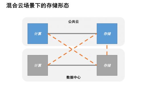 理想状态下,公共云和专有云之间的连接应该是如图所示的状态,使得公共云的计算侧能访问线下的数据,线下计算能访问线上的存储,存储和存储之间能实现统一的管理,这是我们需要做到的。