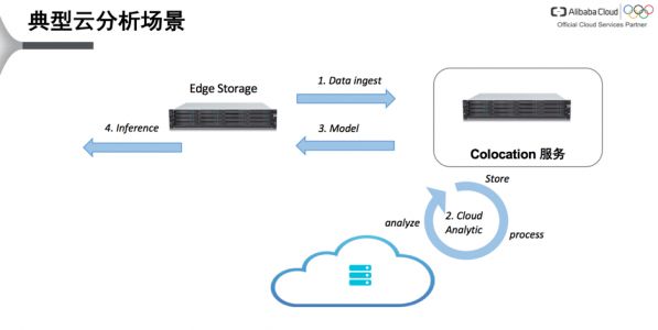 这是一个基于“Colocation“的典型的云分析业务场景。用户在边缘侧(Edge Storage)进行数据收集;边缘侧与Colocation服务下的高性能存储通过数据复制服务进行数据交互;而高性能存储和ECS计算实例之间,基于高速的数据访问,反复迭代计算生成训练模型,然后将模型同步到边缘侧,在边缘进行推断。