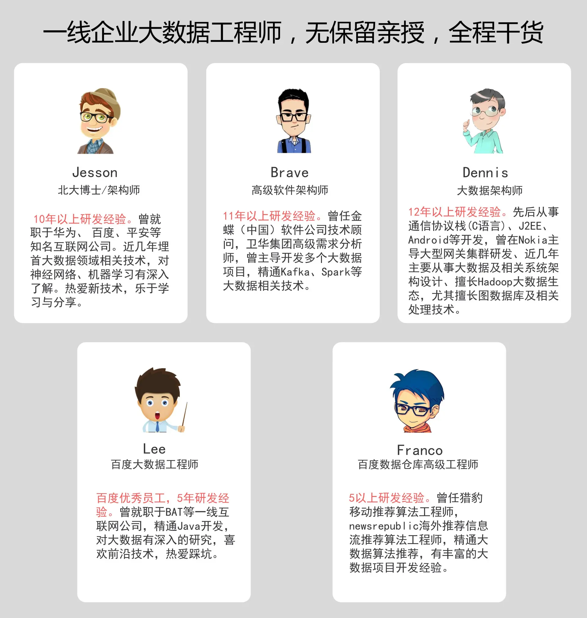 其次,录制这些视频的技术大咖,目前都就职于一线互联网公司,项目经验丰富,他们所面对的数据量和问题,普通企业很难遇到,这些经验非常宝贵和稀缺,是一般公司大数据架构师所不具备的。所以讲课过程中,以实战为核心,结合业务逻辑,让你看一讲视频,胜过你看十篇技术文!