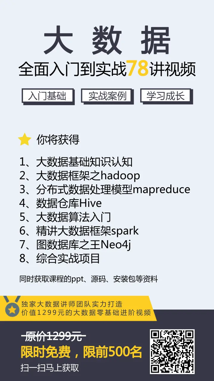 周一,给大家带来一系列的独家大数据精选视频课程,6月份新鲜录制完毕,78讲全程干货,价值1299元,现在限时免费领取,仅限前500名,先拿先得,不要错过!