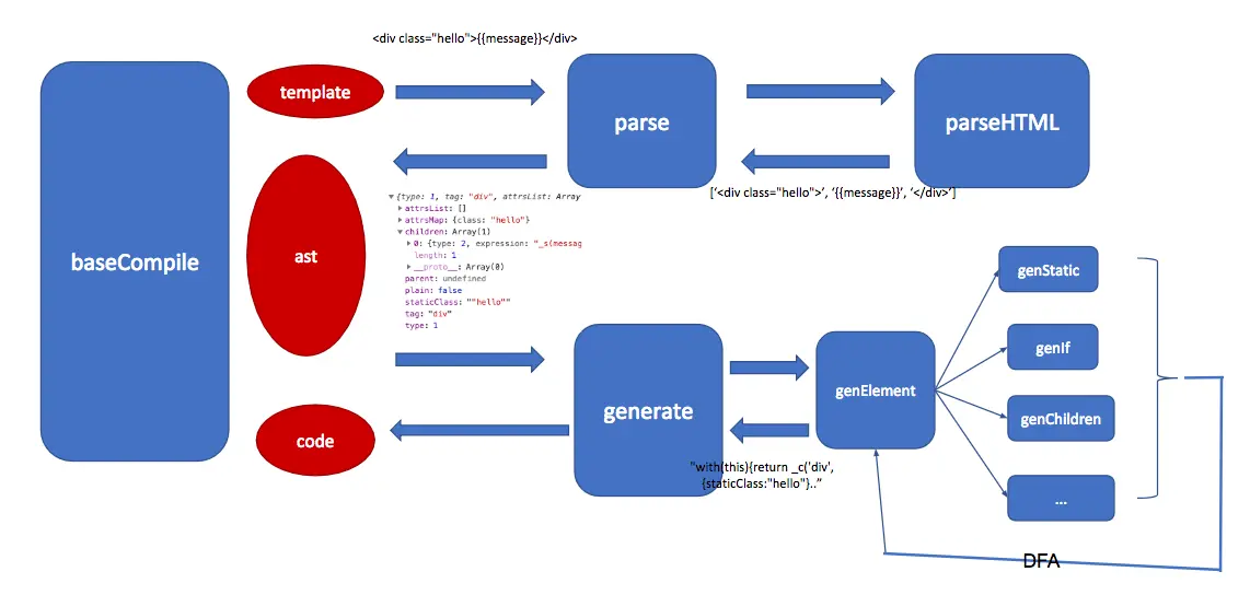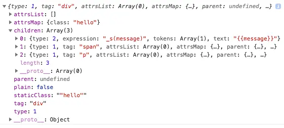 到这里我们弄懂了我们传入的 template 字符串,是如何被编译成render 函数的,其他的细节这里不再详细解读。下一章,我们讲如何 VDOM 的渲染。