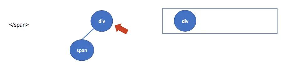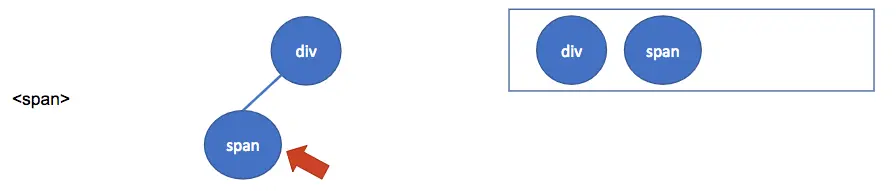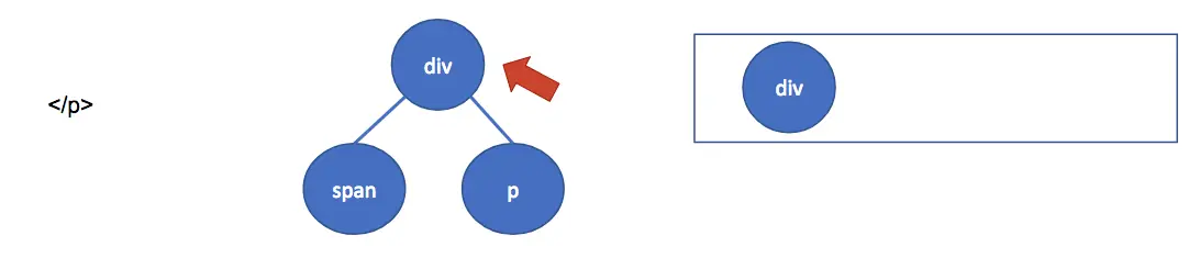 再往下扫描的时候,会碰到 </span> 节点,因为是结束节点,所以进行出栈操作,同时把指针移动到栈的最后一个元素上,也就是 <div> 元素,此时变成这样:
