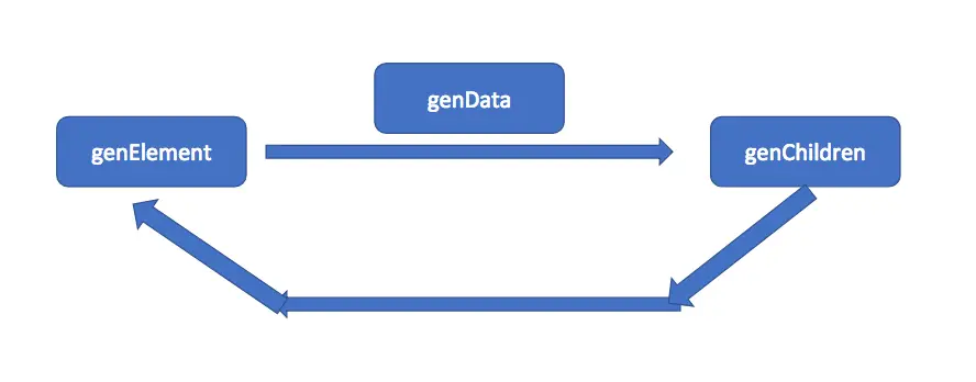 从genElement 入口开始处理根节点,在这个函数内部,会调用 genData 来生成 createElement函数需要用到的 data,这个data包含元素属性上的各种 attributes,我们在模板中可以定义的 class , style, directives 等都会被包含在data中,官方对data 的解释在这里:https://cn.vuejs.org/v2/guide/render-function.html#%E6%B7%B1%E5%85%A5-data-%E5%AF%B9%E8%B1%A1