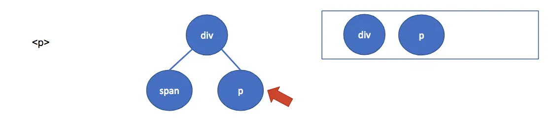 接下来会碰到 <p> 节点,因为是开始节点,所以会创建一个新的元素,并入栈,同时移动指针: