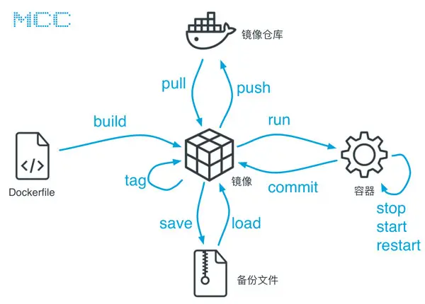 对 Docker 的了解,能读懂下图也就够了,图中有五个对象:镜像、容器、镜像仓库、备份文件、Dockerfile,并且有多个蓝色字体标出的命令,用来将各种对象互相转换、生成,接下来一一介绍:
