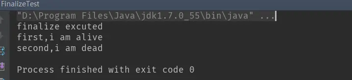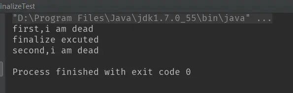 可以看到,finalize方法执行后,test对象又被重新激活了,因此打印了first,i am alive。但是第二次GC的时候,finalize方法并未被执行,因此打印了second,i am dead。前面提到finalize是优先级低不可靠的,那如果没有Thread.sleep(5000),再来看下代码和结果: