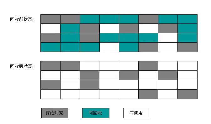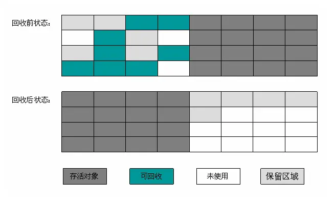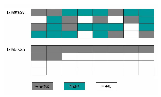 复制法在对象存活率较高时,回收效率就变低了,而在老年代中,大部分的对象都是存活期较高的对象,因此就不适宜采用复制法进行老年代的GC。根据老年代的特点,并结合标记-清除法的思路,于是提出了标记-整理法。其主要思路是:标记过程与标记-清除法一致,只是标记完成后,不直接对未存活进行清除,而是将所有存活的对象都向一端移动,然后清理掉端边界以外的所有内存区域。这种方法的优点是不会产生内存碎片。标记-整理法的算法示意图如下: