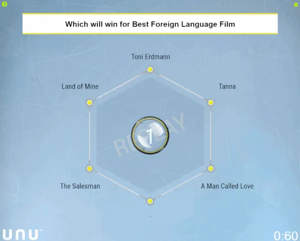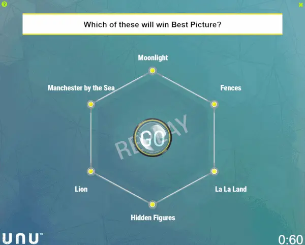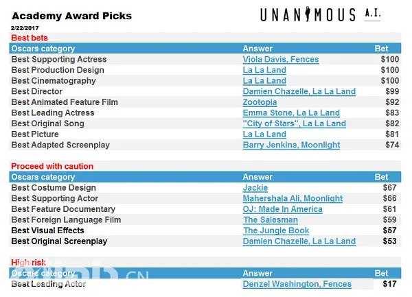这家人工智能公司名为Unanimous,它利用“群集人工智能”(Swarm AI)做了一个平台在奥斯卡颁奖夜做了一个实时预测。预测分成三档,分别是确定性较强的预测、确定性中等的预测、高度不确定性的预测。有意思的是,在最佳影片这一奖项上,Swarm AI为《爱乐之城》给出了确定性较强的预测,但奥斯卡组委会却闹了个乌龙,最终此奖花落《月光男孩》。