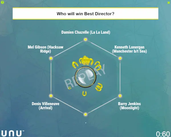 那么这个预测率达到75%的群集人工智能平台是如何进行预测的? Unanimous公司的研究员集合了近50名电影爱好者群集。参与者在公司网站上进行注册后,可以参与预测。在做出判断时,每位用户都有一个可以拖向他们的选择的虚拟圆盘。同时,每个人都可以看见其他人的决定,也可以随时改变自己决定。这个集群中的每个个体都可以互相影响。