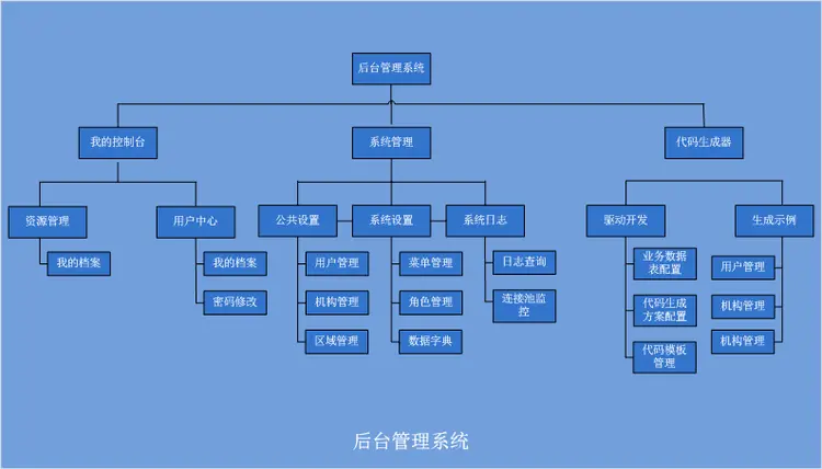 后台管理系统包括企业组织架构(用户管理、机构管理、区域管理)、菜单管理、角色权限管理、字典管理等功能;