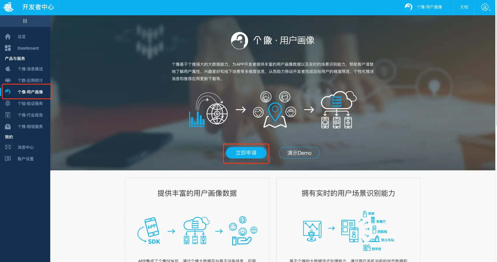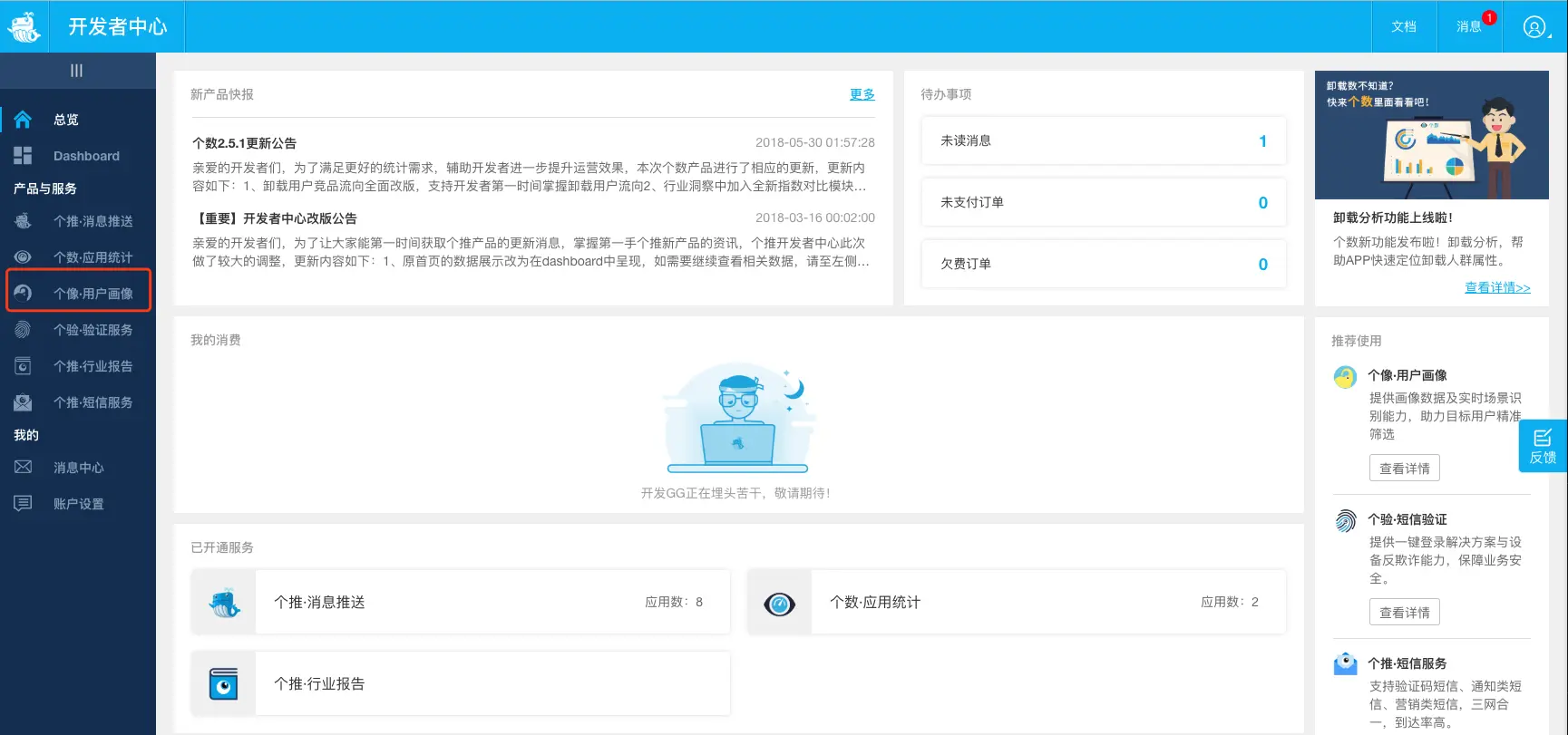 3、返回[个推开发者中心](https://dev.getui.com/dev/#/login),使用上个步骤注册好的账号登录。进入开发者平台面板后,选择左边菜单栏的个像·用户画像: