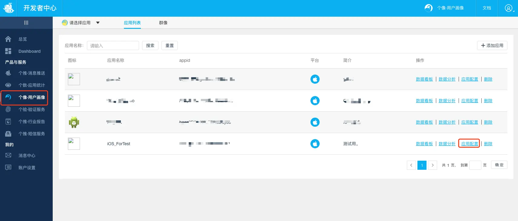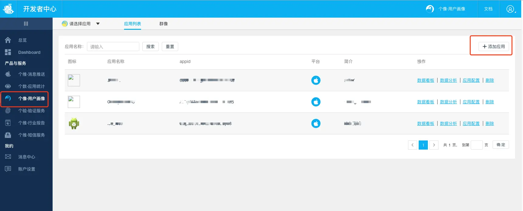 5、填写应用相关信息。等待个像功能开通完成后,重新进入个像功能菜单,点击添加应用按钮: