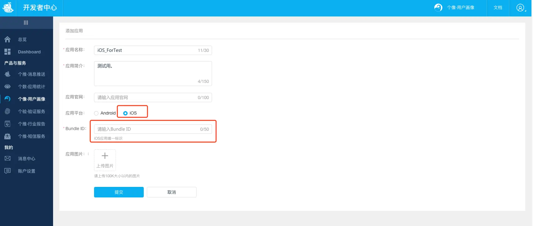 6、应用平台位置勾选iOS,并且需要填写待接入应用的Bundle ID。完善页面信息后,点击提交新增应用: