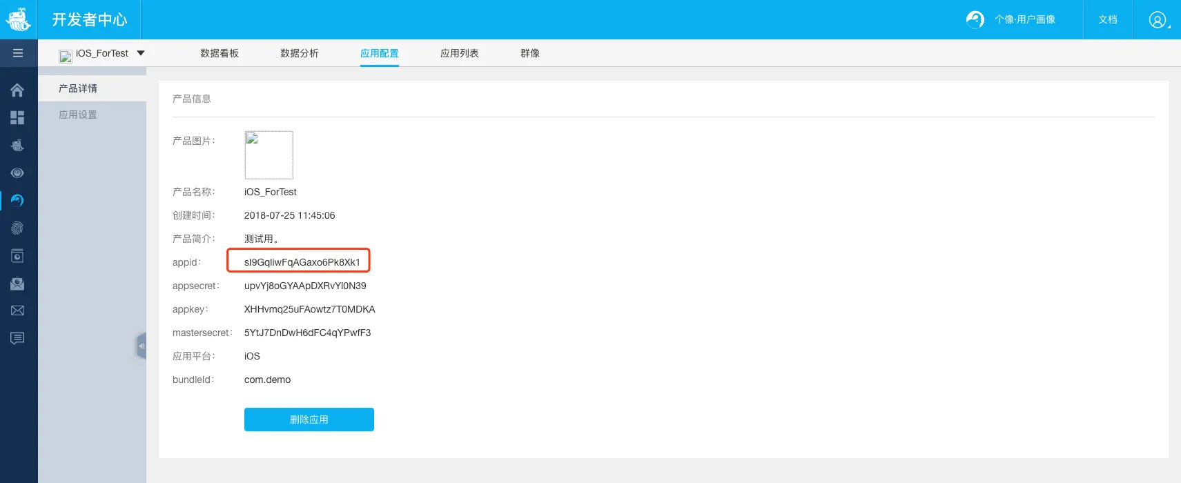 8、在配置信息下可以看到APP ID,我们可以将其复制保存。在后续集成步骤中,我们将会使用到APP ID: