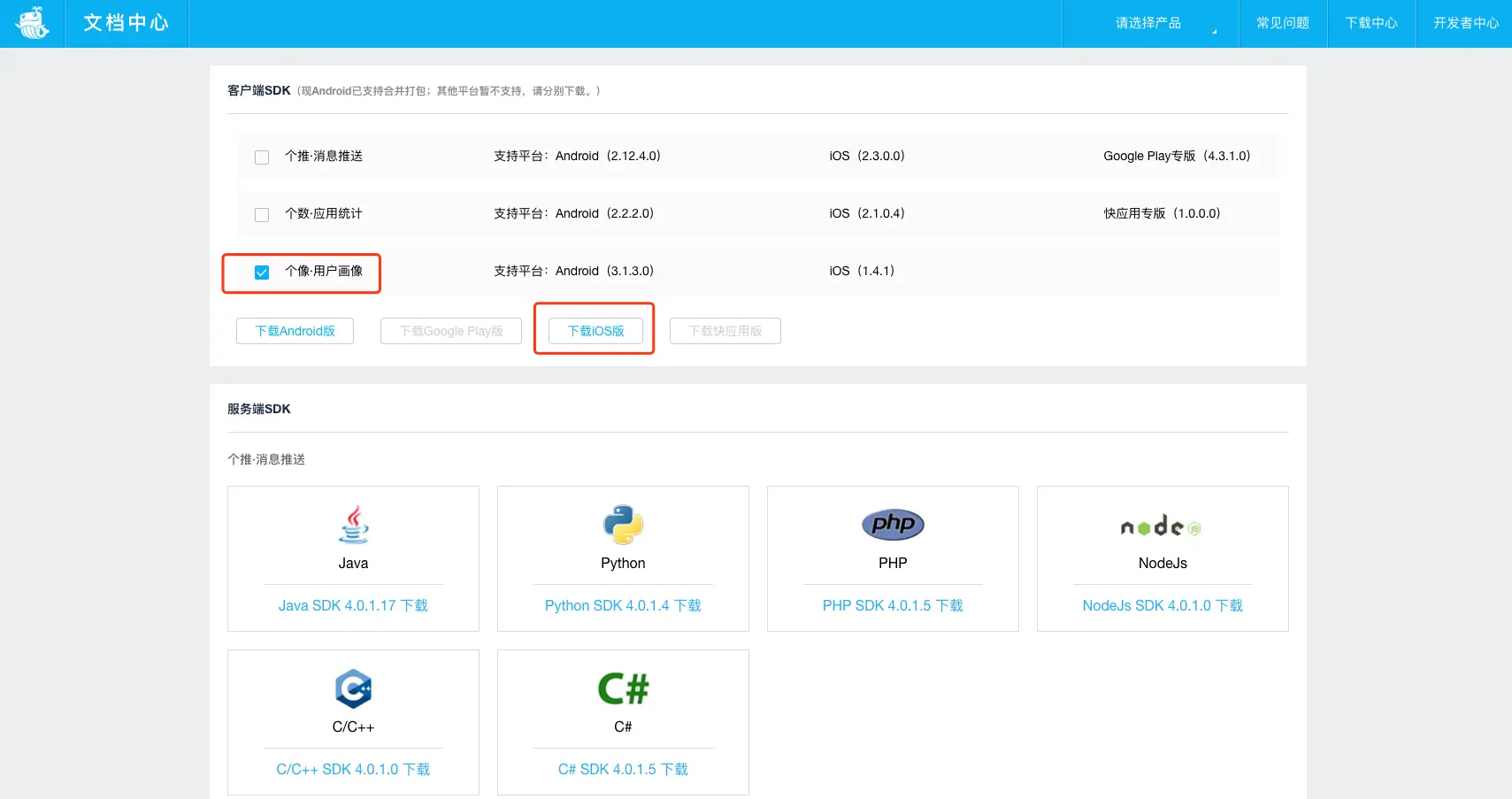 1、个推用户画像提供了一个SDK开发工具包,它包含了iOS SDK所需的全部资源,下载地址:http://docs.getui.com/download.html。勾选个像·用户画像,点击下载iOS版按钮,即可下载SDK资源包: